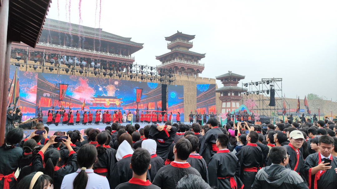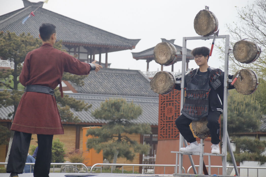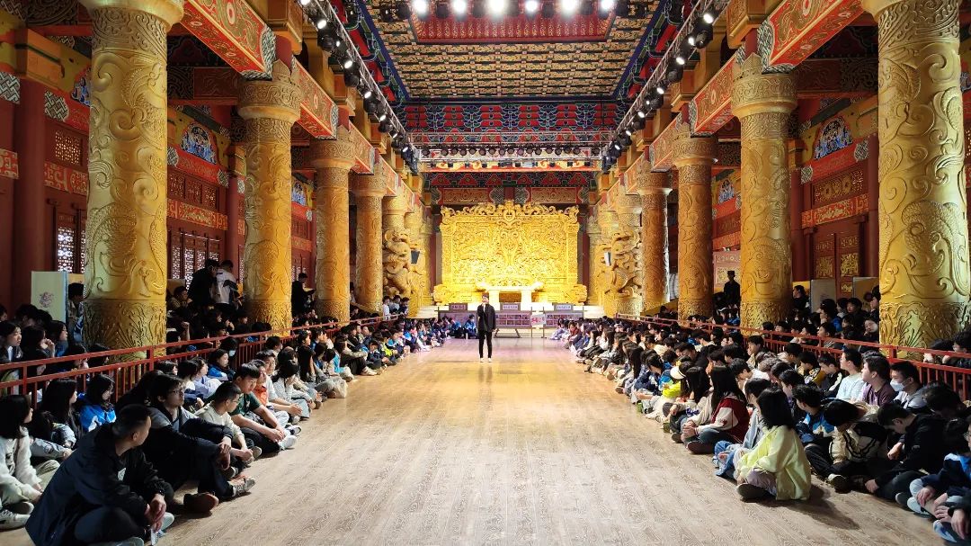 大型开场节目《御林军开城迎宾》在朱雀门前的天街御道上演,魁梧威猛的御林军仪仗队,为游人献上精彩的演出,使同学们身临其境感受古代皇家礼仪的魅力与威严。
