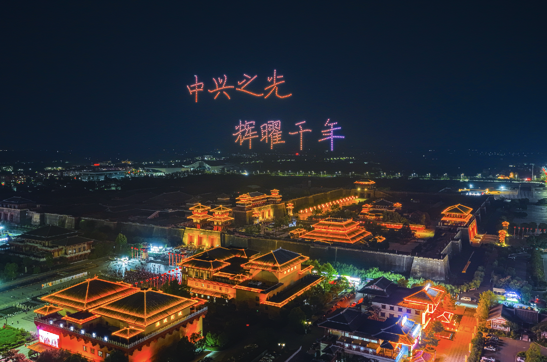 最后,夜空呈现出"中兴之光 辉耀千年"和"中国汉城"的字样,为这场跨越时空的对话画上了圆满的句号。这一刻,历史与现实交相辉映,传统文化与现代科技完美融合。